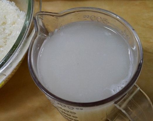 그리고 밥을 하기 위해 쌀을 씻는 과정에서 나오는 쌀뜬물을 아까 물양을 잰 국그릇으로 2그릇 정도 남겨주세요. 이때 쌀뜬물은 첫번째 쌀을 한번 씻어내고 2번째 나오는 물부터 사용하시는 것 아시죠?